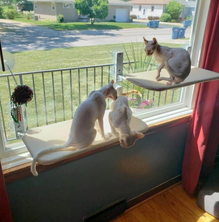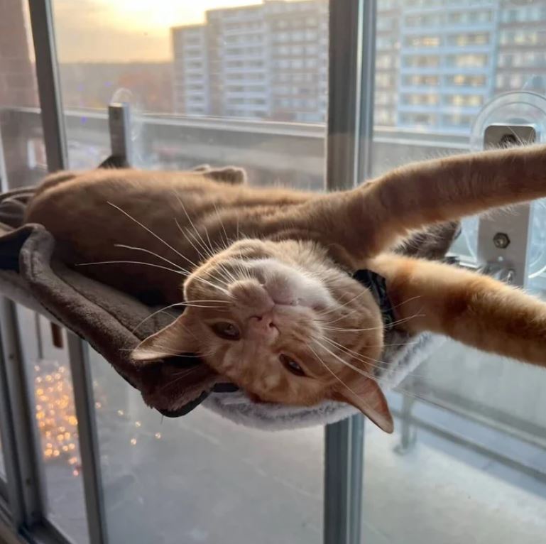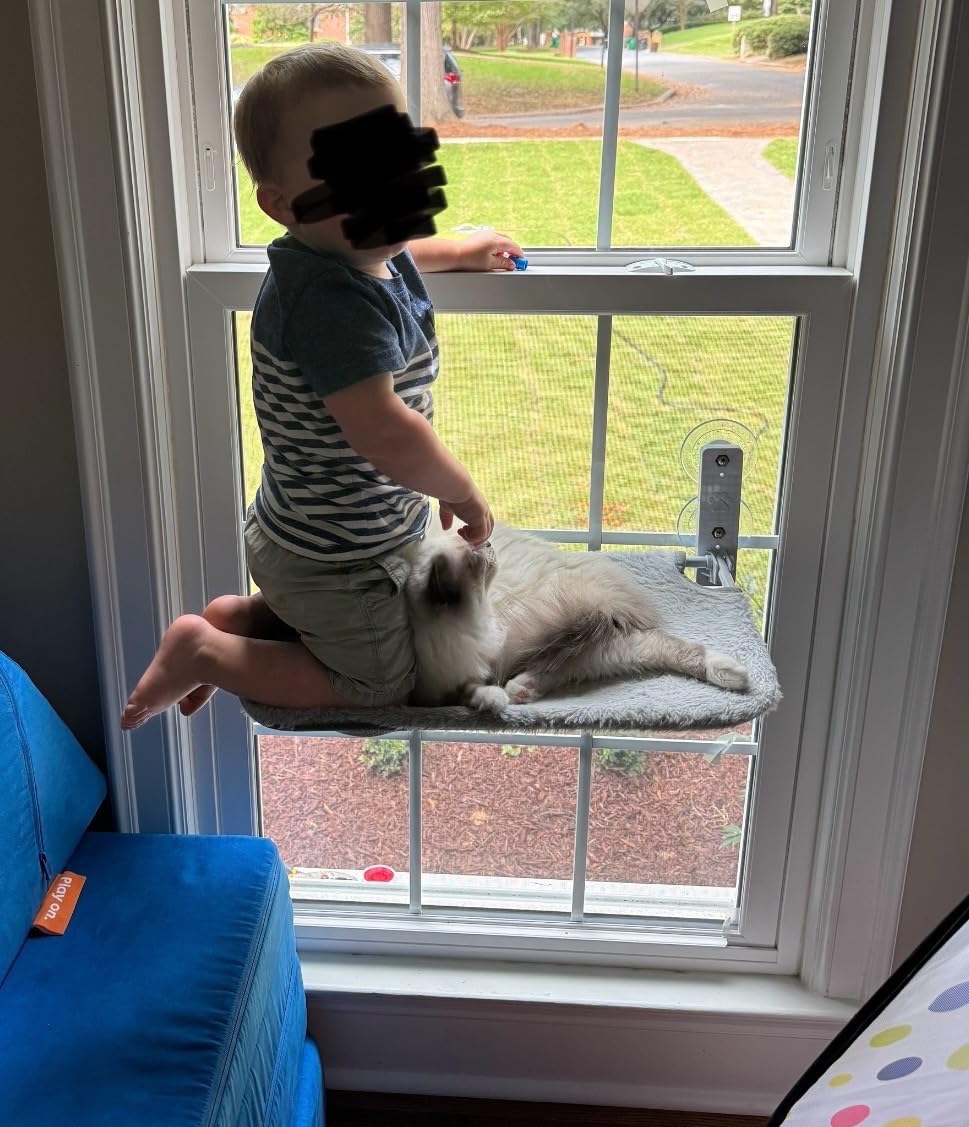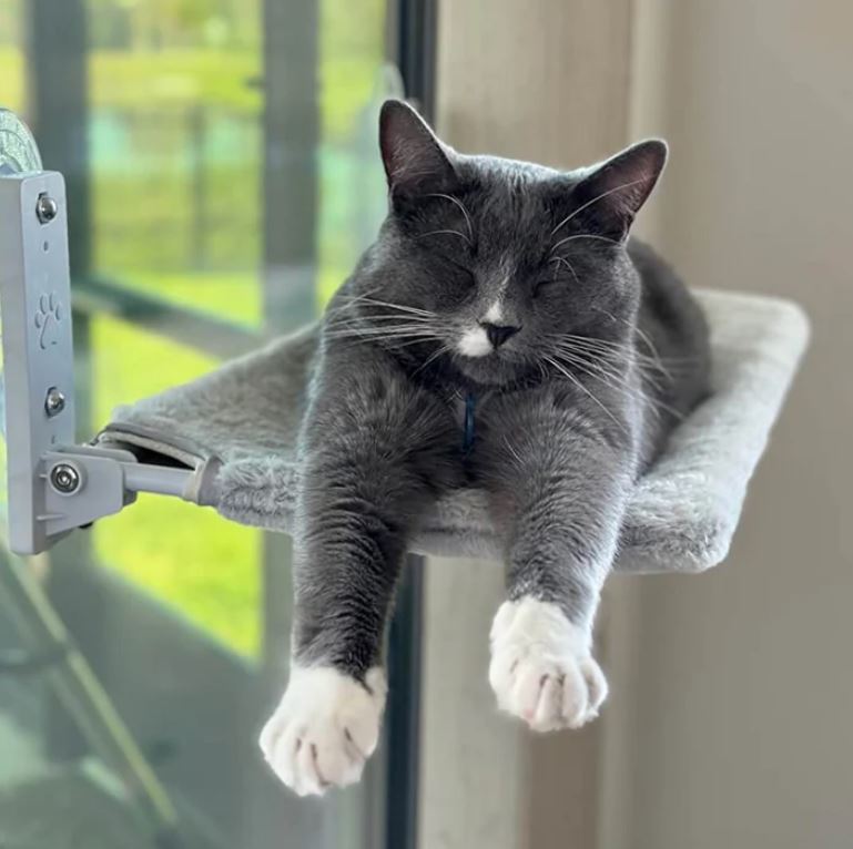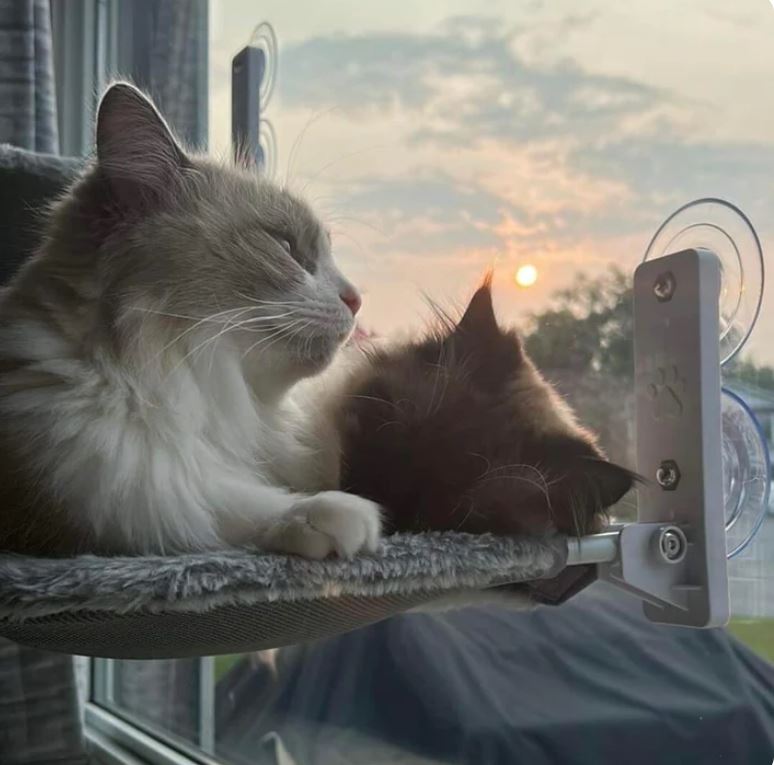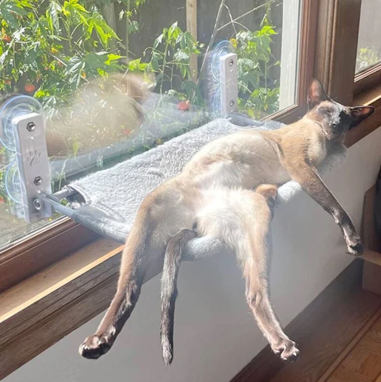 “Vår äldre katt, Zorro, älskar den här hängmattan! Han ligger där hela dagarna och solar sig i fönstret medan vår lilla kattunge försöker ta sig upp. Bästa köpet någonsin, båda katterna är aktiva och nöjda!”